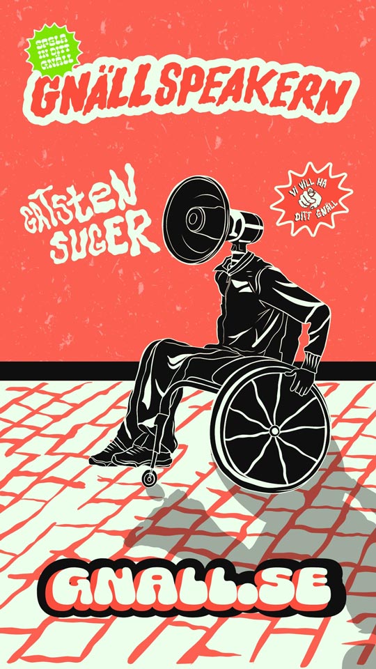 Trött på att samhället ser din funktionsnedsättning som ett hinder? Då är dags att spy galla, för det är du värd. Välkommen att gråta, skrika, prata eller varför inte sjunga in din ilska på Gnällspeakerns kampanjsida. Därefter har du och Göteborgs stad att vänta ett eko av aggression riktat mot ett samhälle som utlovar guld och gröna skogar men talar med tomma ord.